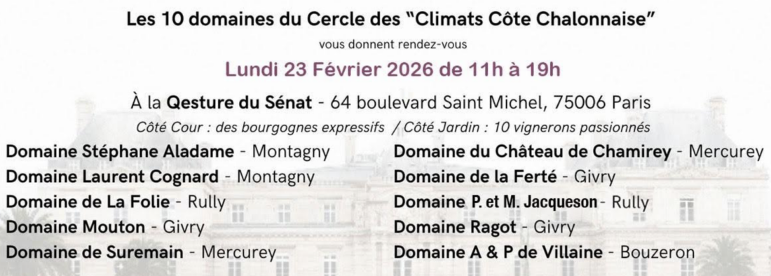 Dans le cadre de l’association Climats Côte Chalonnaise, nous organisons cette année encore une dégustation à la Questure du Sénat le 23 février prochain. Nous espérons pouvoir vous y accueillir pour vous faire déguster le dernier millésime (+ en avant-première un tout petit nouveau qui sera prochainement disponible).